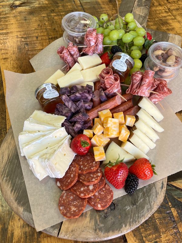 Charcuterie Board of Artisan Meats Accompanied by Local Cheeses, Marinated Olives, House Nuts, Fruit Preserves + Autumn Fruit Served with Baguette -48 Hour Pre Order Required